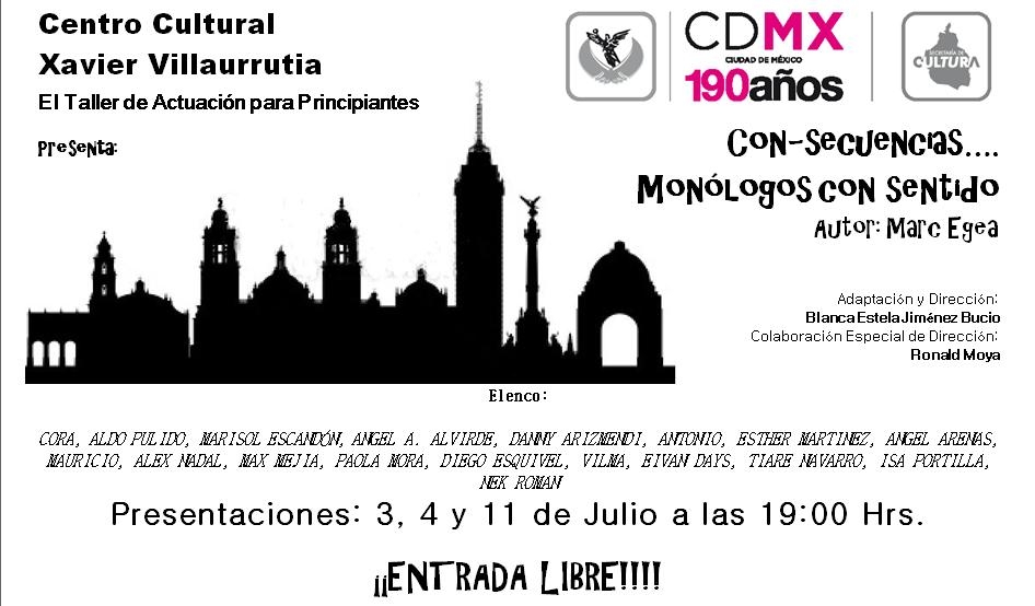 Los próximos días 3, 4 y 11 de julio se representará, en el Centro Cultural Xavier Villaurrutia de Ciudad de México, un montaje elaborado por Blanca Estela Jiménez Bucio a partir de monólogos breves, titulado: «Con-Secuencias… Monólogos con sentido«. La dirección corre a cargo también de Blanca Estela Jiménez Bucio.