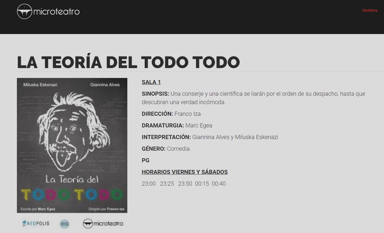 Esta semana, dentro del ciclo titulado «Por tus intereses», se estrena «La teoría del todo todo» en Microteatro Lima (Perú). Una conserje y una científica se liarán por el orden de su despacho, hasta que descubran una verdad incómoda.