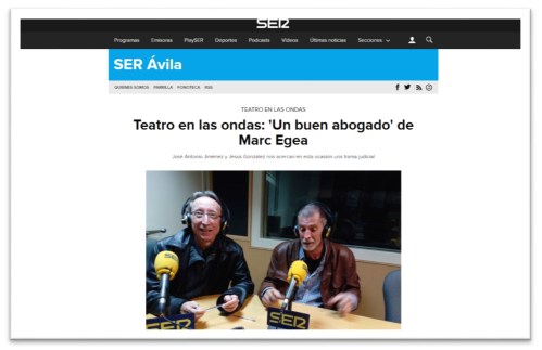 El programa de radio «Teatro en las Ondas» de la Cadena SER ha dramatizado este mes una versión de la obra de microteatro «Una buena abogada» titulada «Un buen abogado«. La pieza está interpretada por los actores José Antonio Jiménez y Jesús González que anteriormente ya dieron voz a las adaptaciones radiofónicas de «Yerma» de Federico García Lorca y «La cena de los idiotas» de Francis Veber.