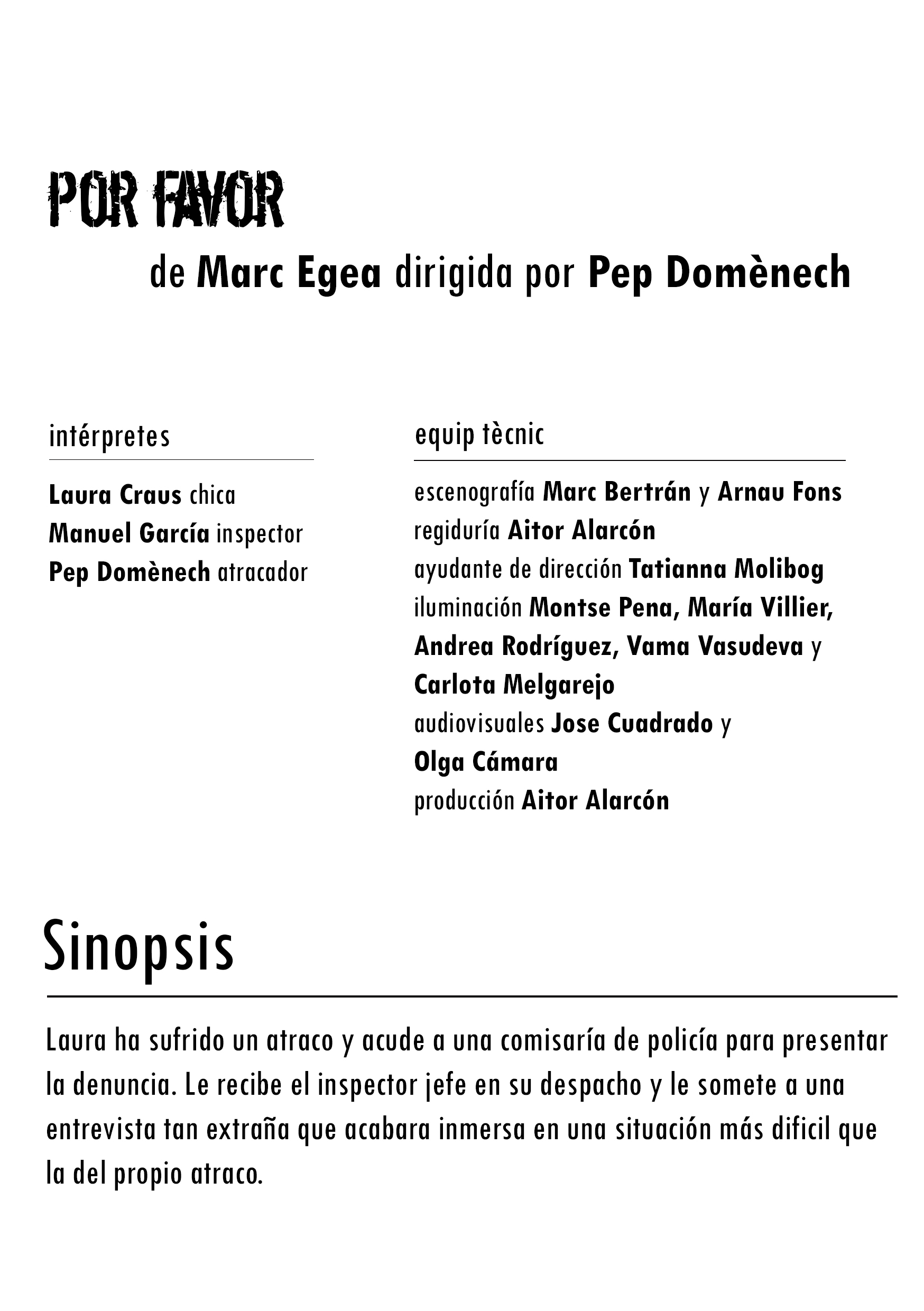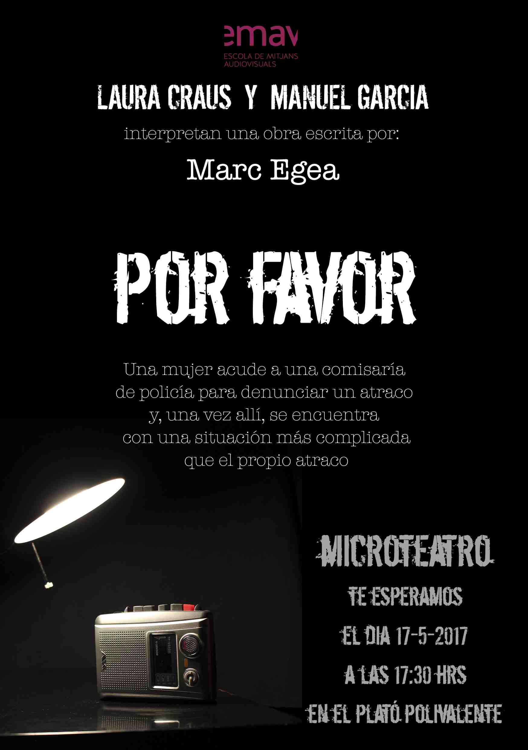 El próximo miércoles 17 de mayo tendrá lugar en Barcelona un pase especial de la obra «Por favor» en la sede de la Escola de Mijans Audiovisuals (EMAV). Este nuevo montaje está dirigido por Pep Doménech y es la segunda versión de esta obra que se lleva a escena en la ciudad de Barcelona.