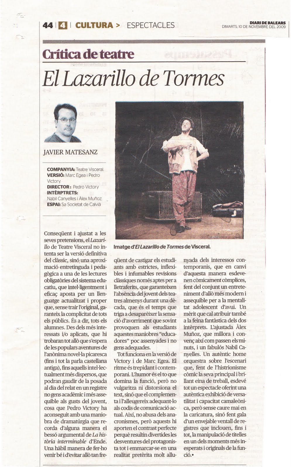 CONOCIENDO A LÁZARO. Crítica al montaje realizado por la compañía Teatro Visceral, dirigida por Pedro Victory. Esta crítica, de Javier Matesanz, fue publicada en el Diari de Balears, el martes 10 de noviembre de 2009.