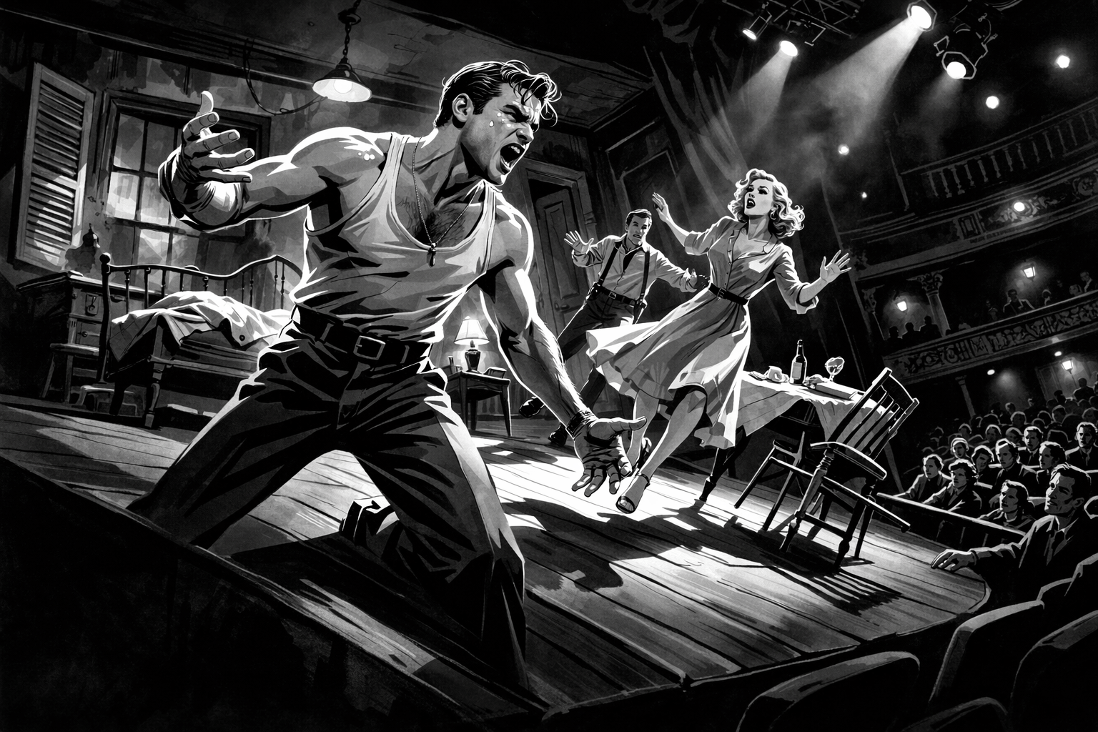 Cuando la historia pasó al cine en 1951, esa asociación quedó definitivamente consolidada. Hoy resulta casi imposible pensar en Stanley Kowalski sin pensar en Marlon Brando. Pero si uno vuelve al texto de Tennessee Williams, la arquitectura dramática sigue apuntando hacia Blanche DuBois. Es su historia, su caída y su fragilidad lo que constituye el verdadero recorrido de la obra.
