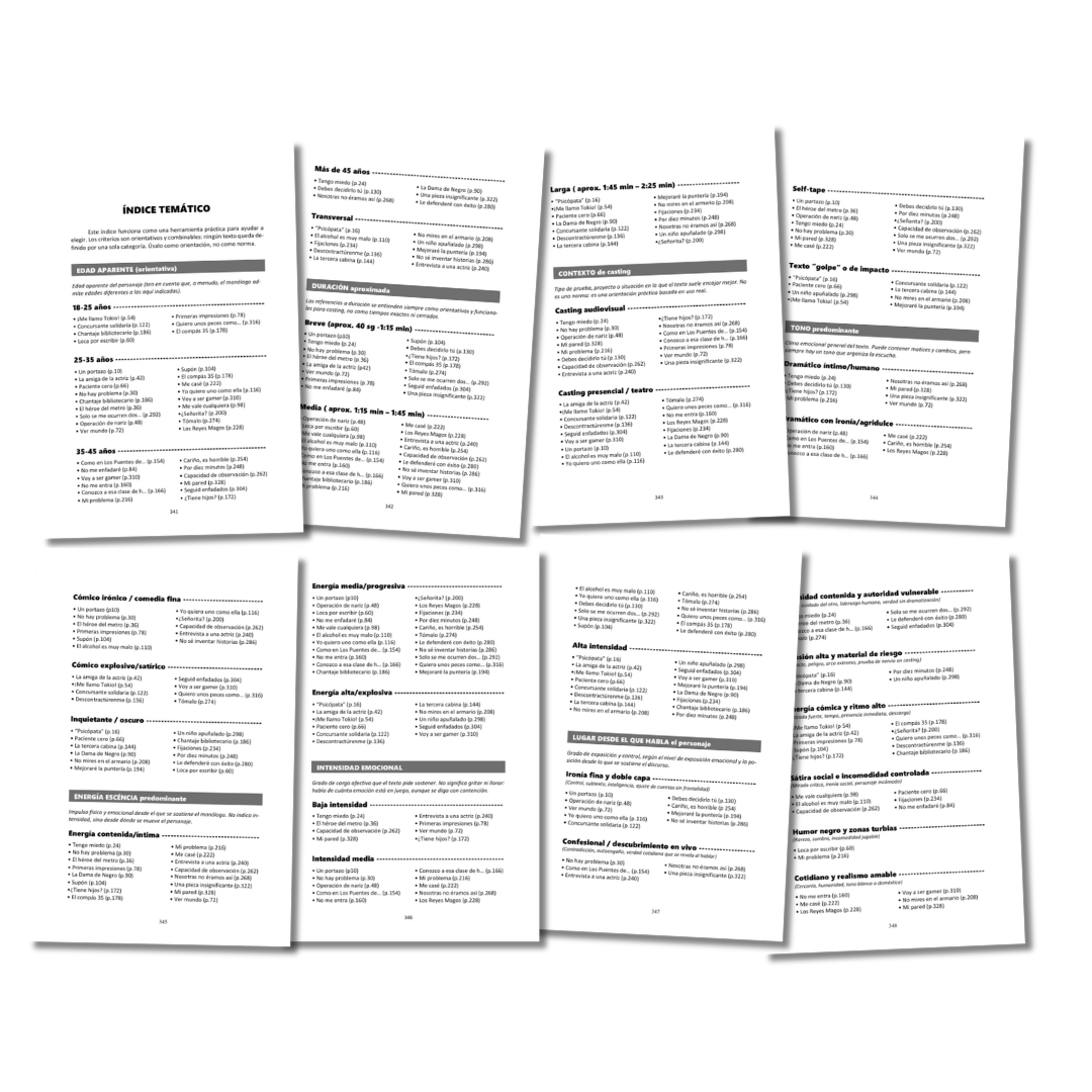 El índice, además, no establece una jerarquía de “mejores monólogos”. No es un ranking. Hace algo más útil: evita que la elección dependa únicamente del orden en que los textos aparecen. Elegir empieza muchas veces por descartar, y el índice temático ayuda precisamente a eso: a reducir ruido, acotar, comparar y situar la decisión en un marco más claro.