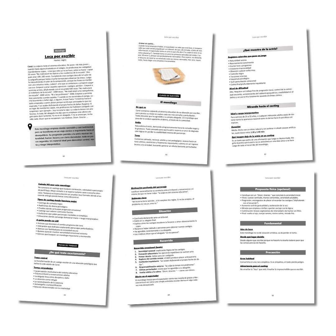 Pensados específicamente para pruebas de casting y trabajo actoral. Textos breves, intensos y abiertos a distintas lecturas, creados para que la actriz pueda mostrar su rango interpretativo y construir una propuesta propia.