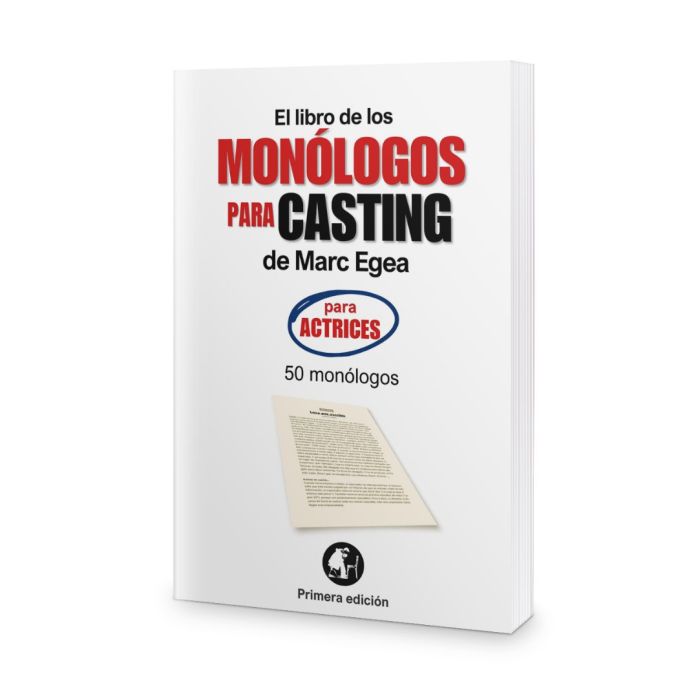 Todos los monólogos, bien y clasificados, en El libro de los monólogos para casting (para actrices), donde vienen acompañados de completas fichas de trabajo para extraer lo máximo de ellos.