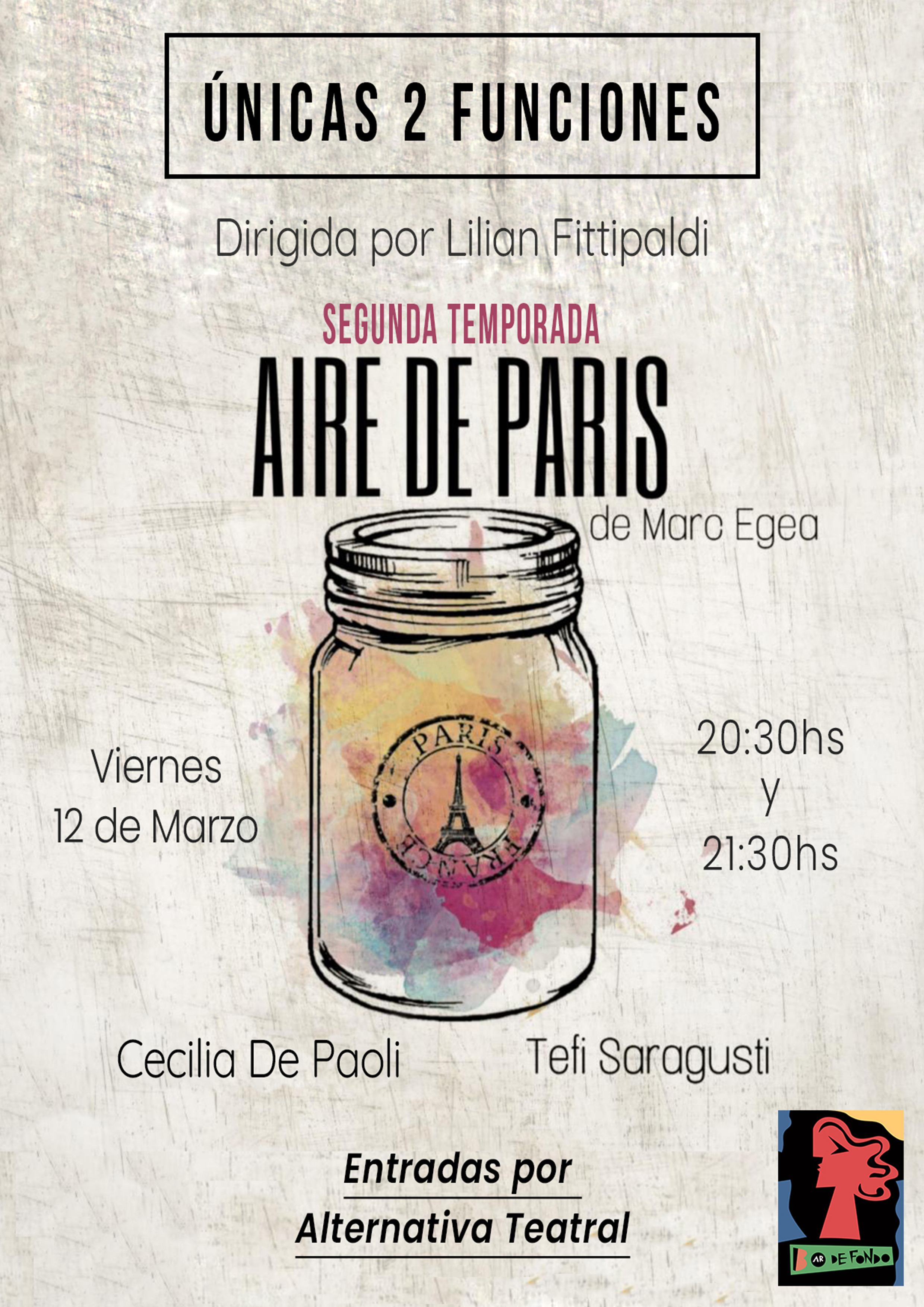 Son varias las producciones que vienen representado últimamente «Aire de París» en Argentina. Ahora le toca el turno al montaje dirigido por Lilian Fittipaldi, que podrá verse el próximo viernes 12 de marzo en Palermo (Buenos Aires), en una sesión doble. Está protagonizado por Tefi Saragusti y Cecilia de Paoli.…
