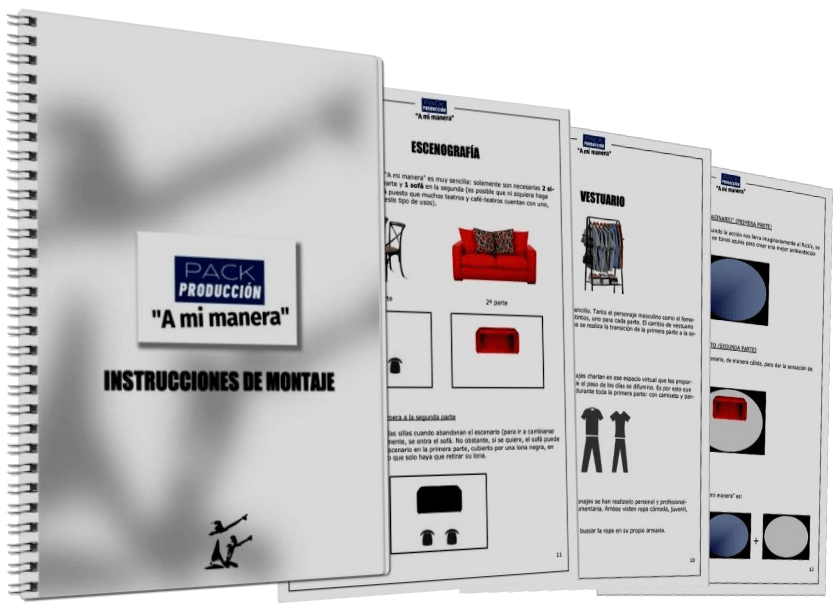 Un Pack Producción es la habitual licencia para representar una obra de teatro sólo que, novedosamente, incluye unas «Instrucciones de montaje» -y los elementos necesarios- para que incluso un actor o actriz pueda producirla.